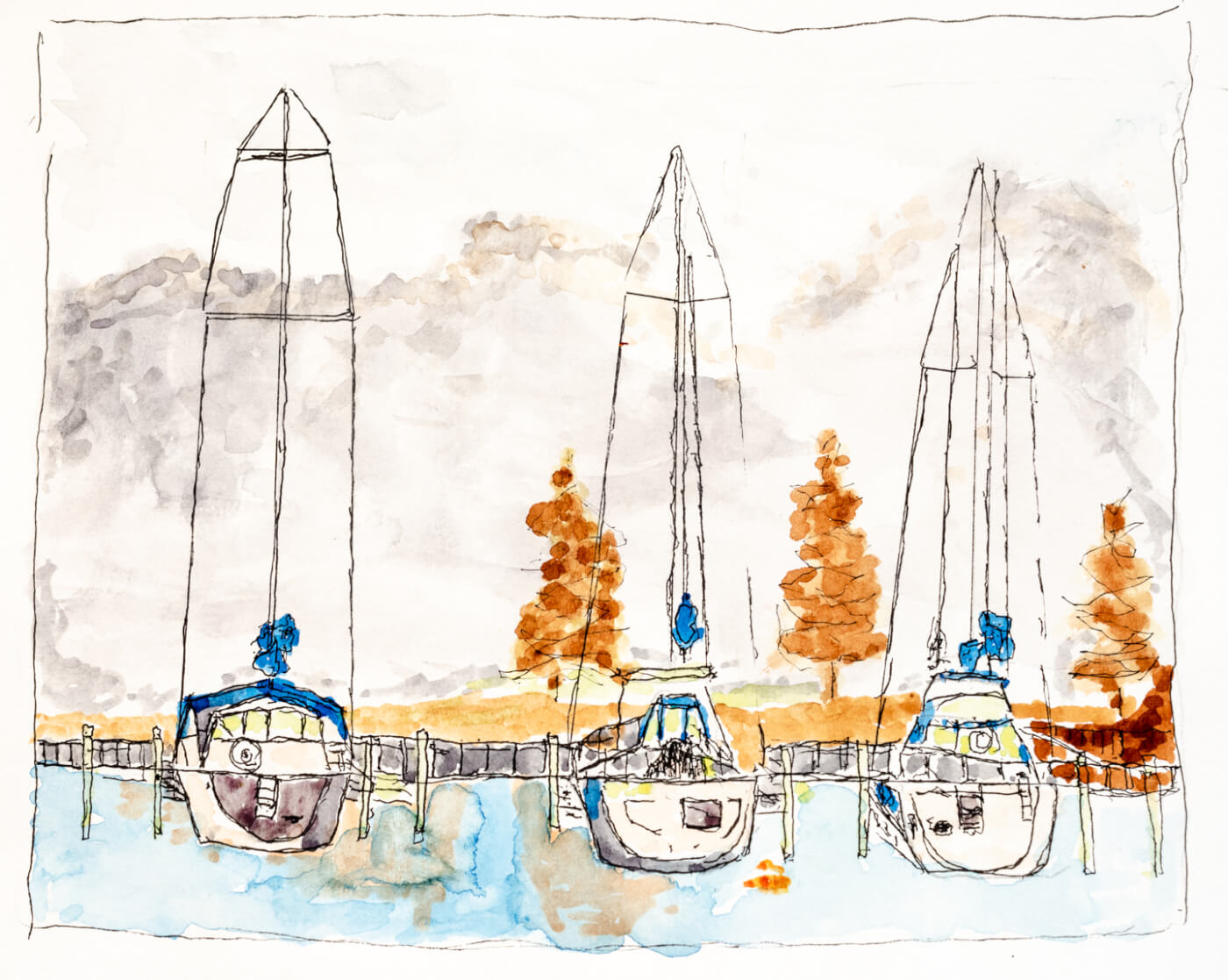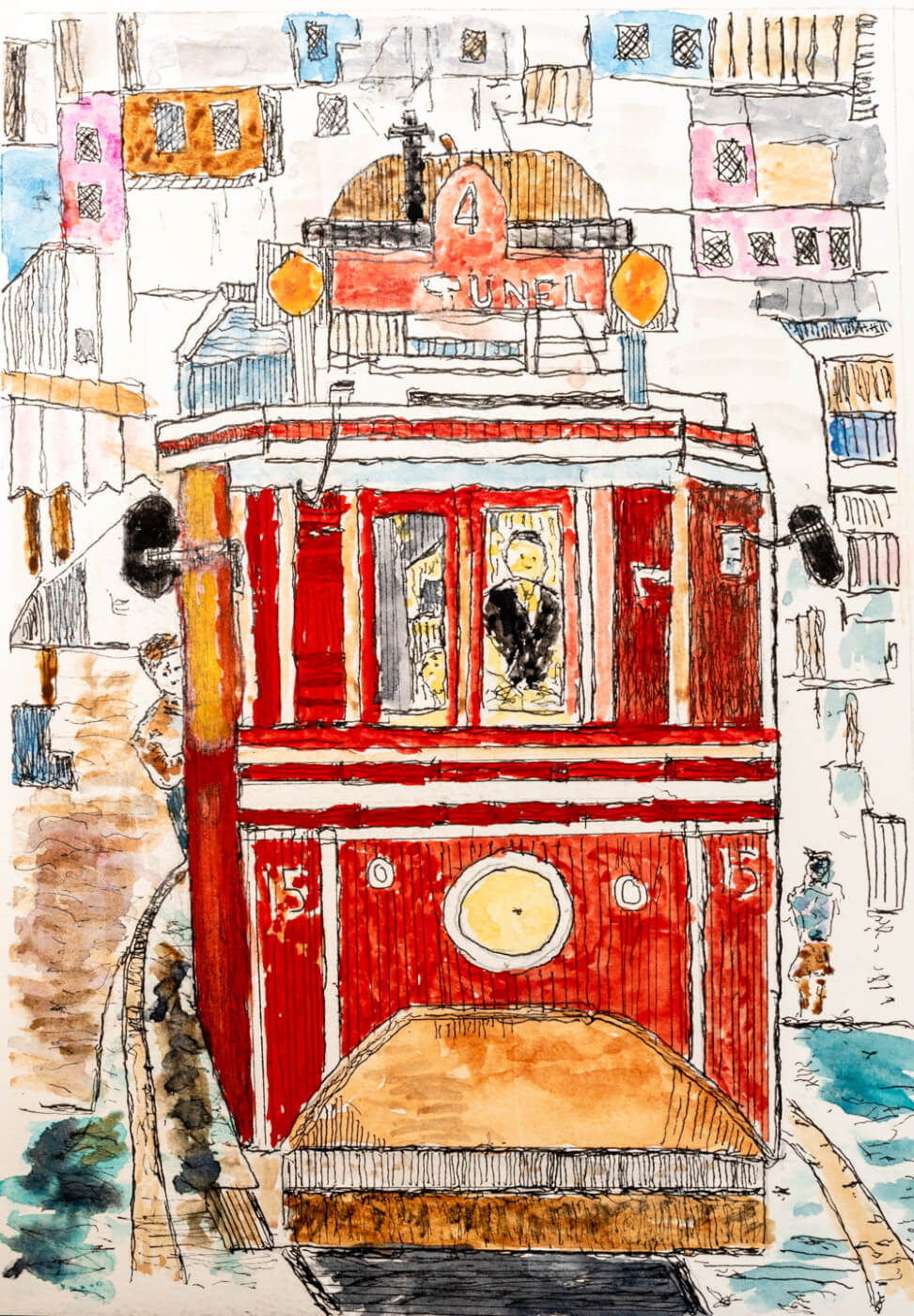 Jim’s watercolor and ink world is full of carefully sculpted bridges and museums, winding country roads, bobbing sailboats, and big, red trolleys gliding down steep city streets. There is careful attention paid to the construction of every paper structure, where lines meet like joints and rigging is detailed in full. But the edges of the lines and color seem to vibrate, softening the entire image. The colors themselves are full of earthy blues, yellows, and browns, and the occasional surprising pop of crimson or terracotta.