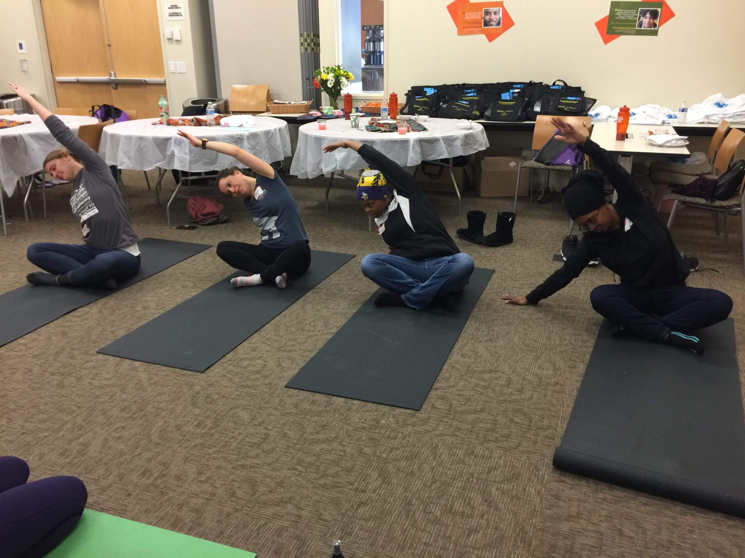 A yoga class led by Kirsten DeHaven encouraged mind-body wellness. Several moms and Simpson staff members practiced breathing, meditation, and yoga poses.